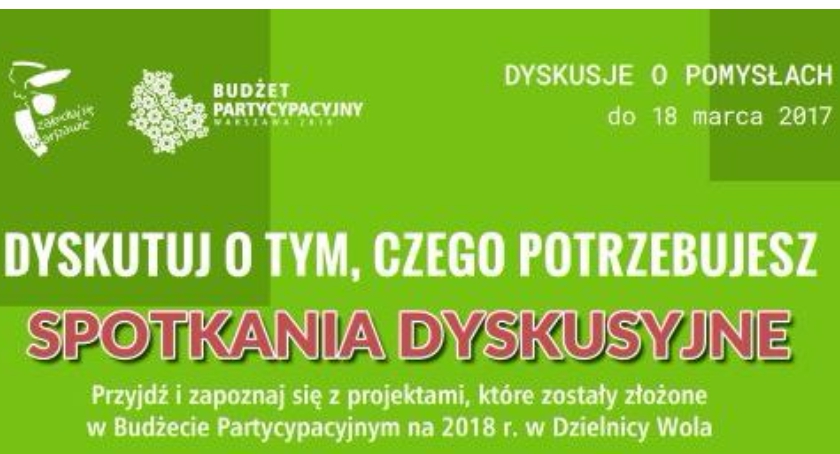 - 11 marca od godz. 14:30 – projekty ogólnodzielnicowe – sala sesji w Urzędzie Dzielnicy Wola m.st. Warszawy przy al. Solidarności 90.